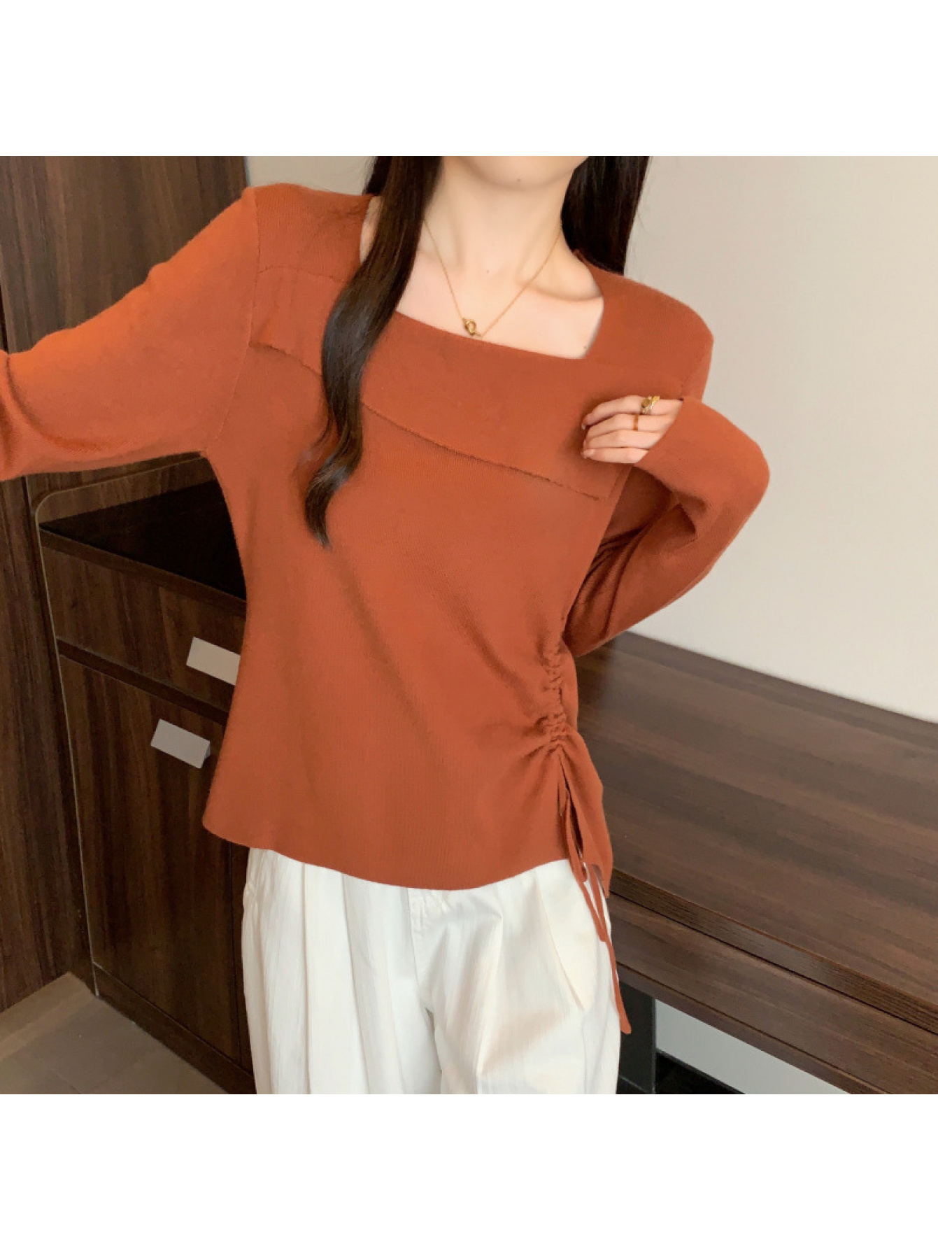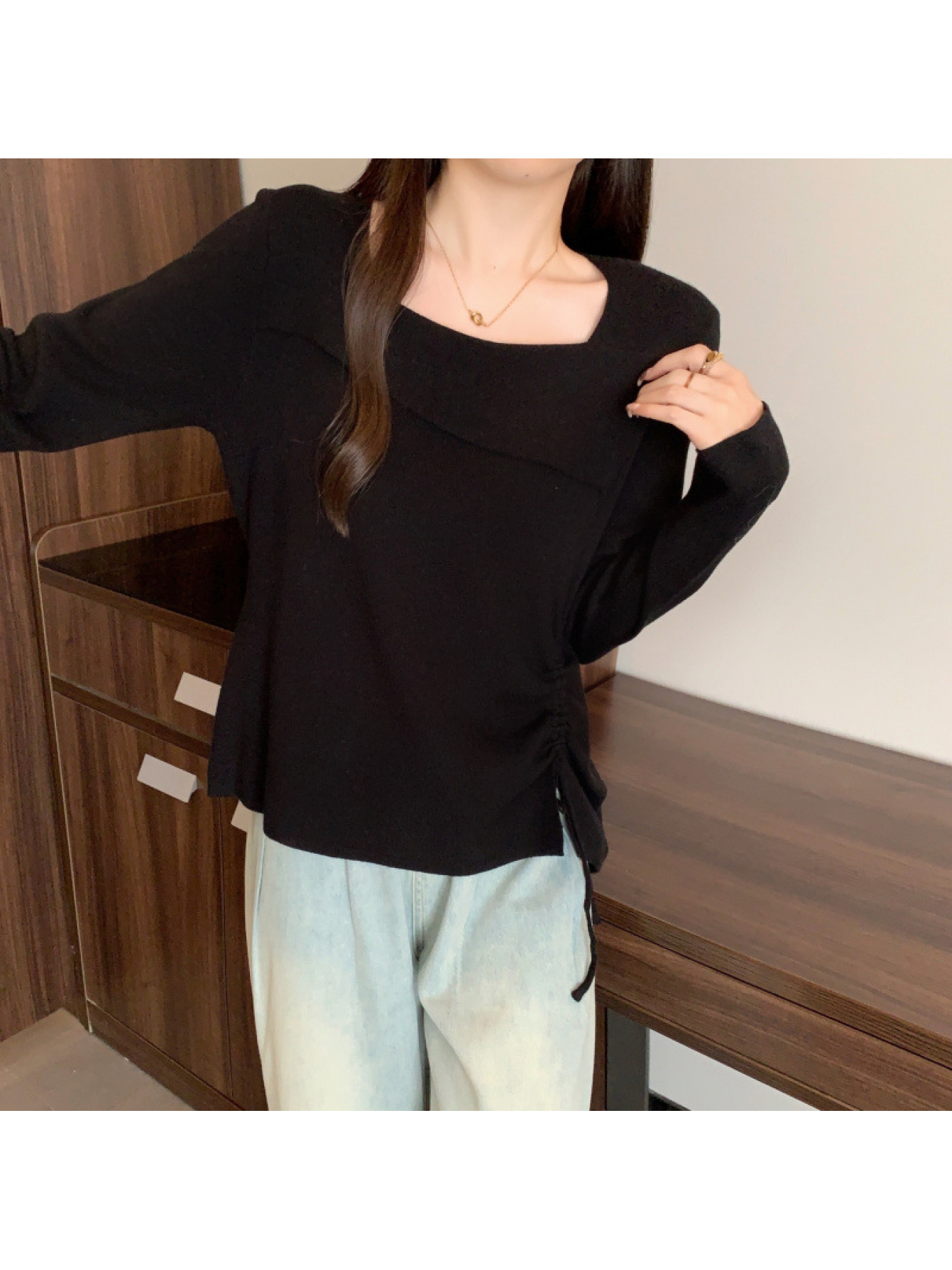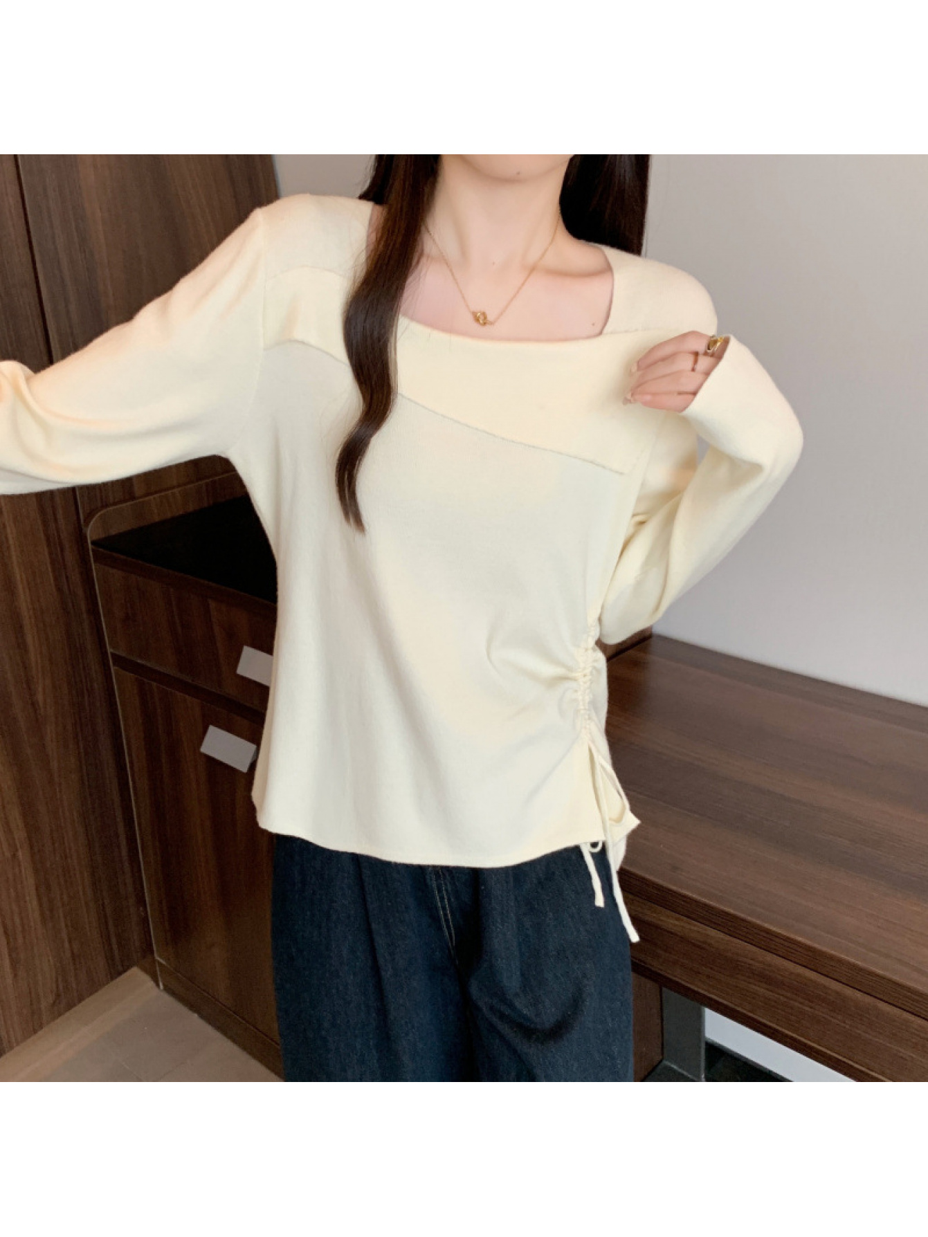 Plus Size, Autumn New Plus Size Square Collar Asymmetric Long-Sleeved Sweater Cinched Drawstring Bottoming Top