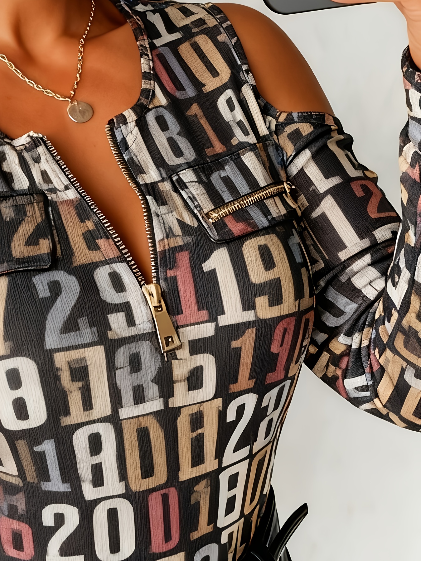 Plus Size - Plus Size, Plus Size Women'S Off-Shoulder Sweater with Metal Chain Accent - Vibrant Orange & Multicolor Floral Print Round Neck Long Sleeve Top, All-Over Pattern Casual to Semi-Formal Shirt for Spring/Autumn, Regular Fit Versatile Everyd