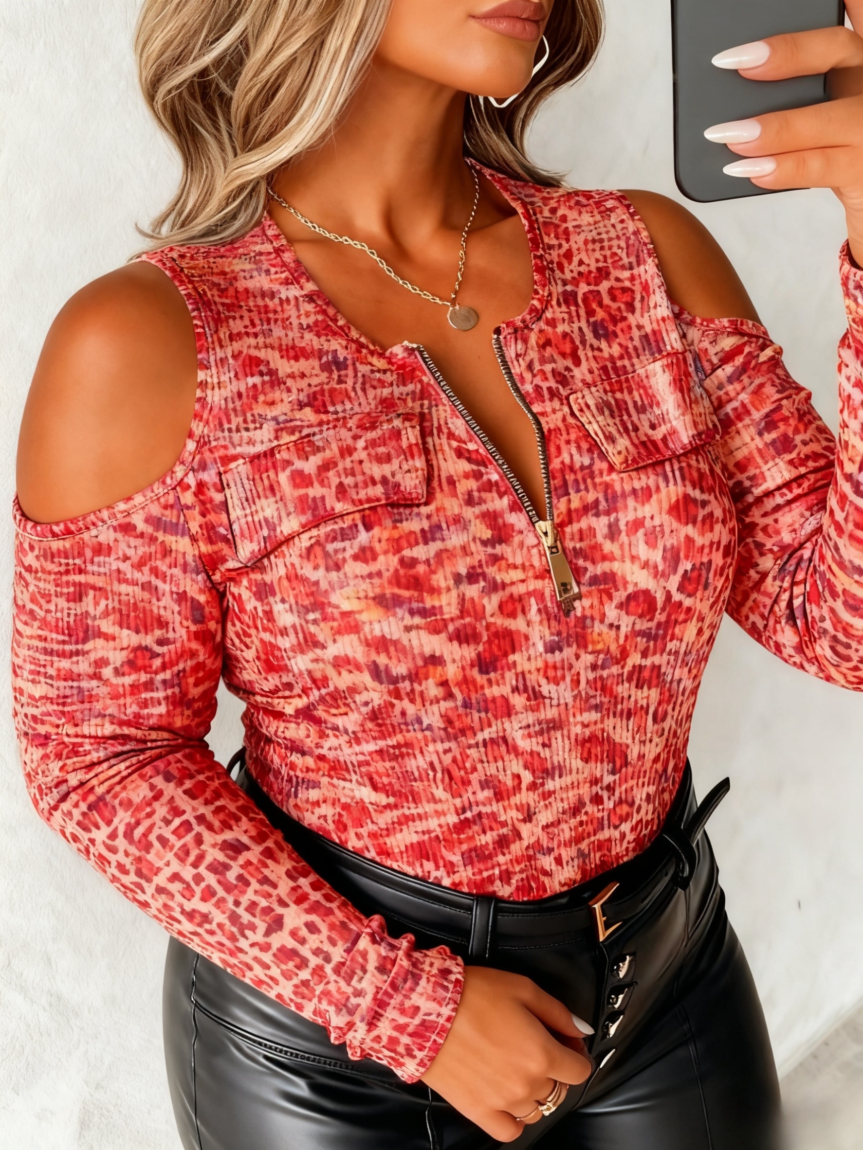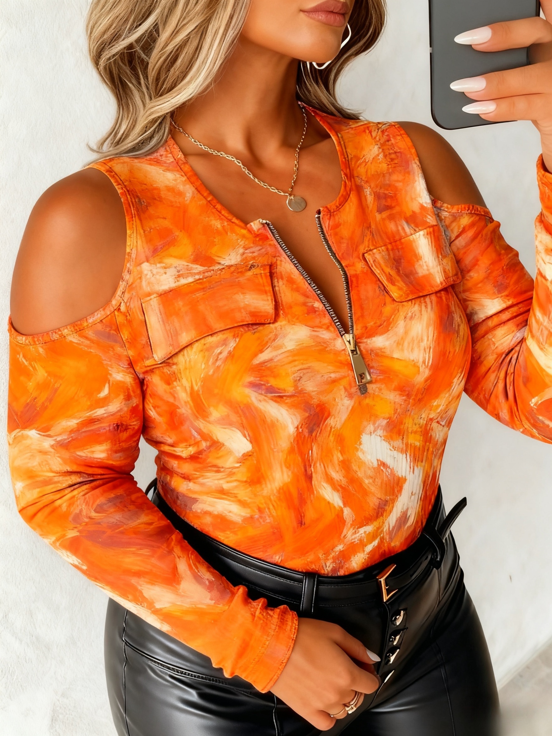 Plus Size - Plus Size, Women'S Plus Size Off-Shoulder Sweater with Full-Body Print & Metal Chain Accent - Round Neck Long Sleeve Casual to Semi-Formal Top, Vibrant Orange/, Regular Fit Spring/Autumn Sweater for Everyday & Special Occasions
