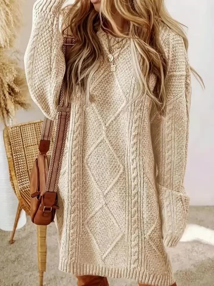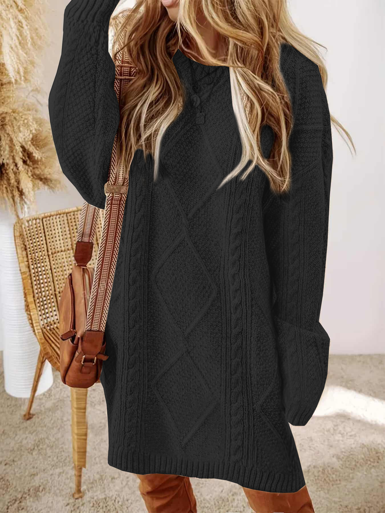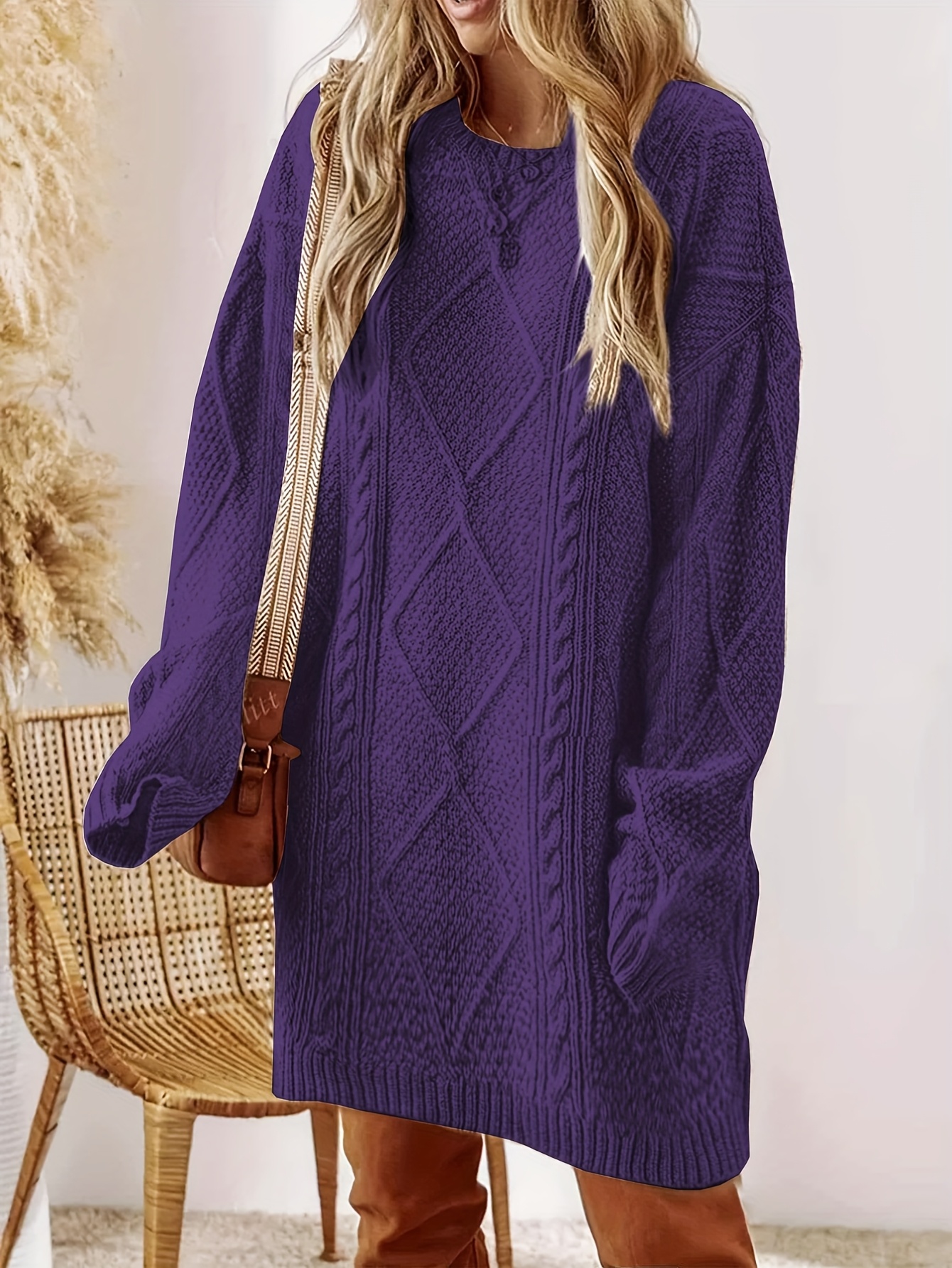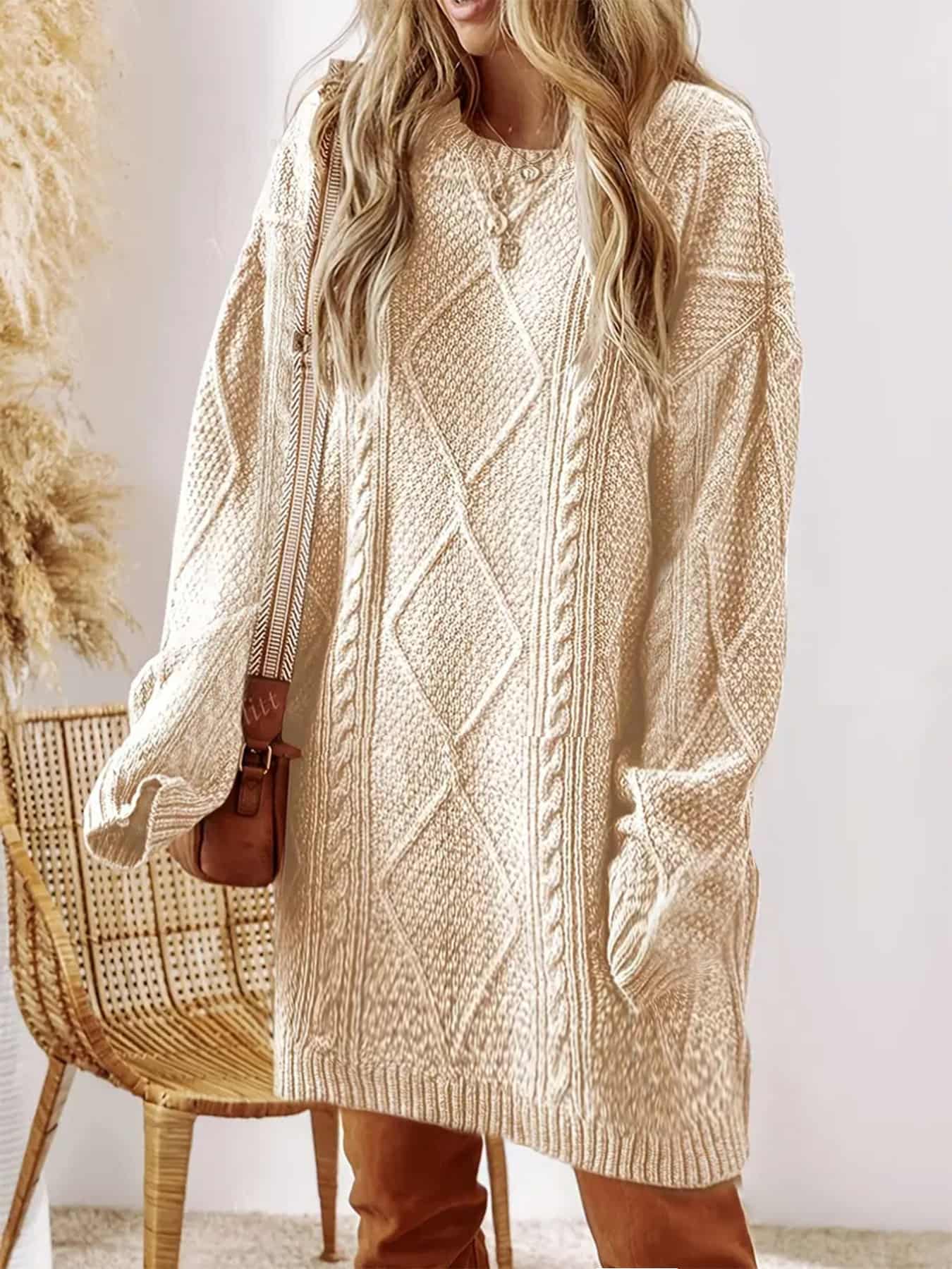 Plus Size - Women'S Plus Size Crochet Diamond Jacquard Drop Shoulder Sweater Dress - Loose and Casual Mid-Length Sweater, Warm and Comfortable, Perfect for Fall and Winter