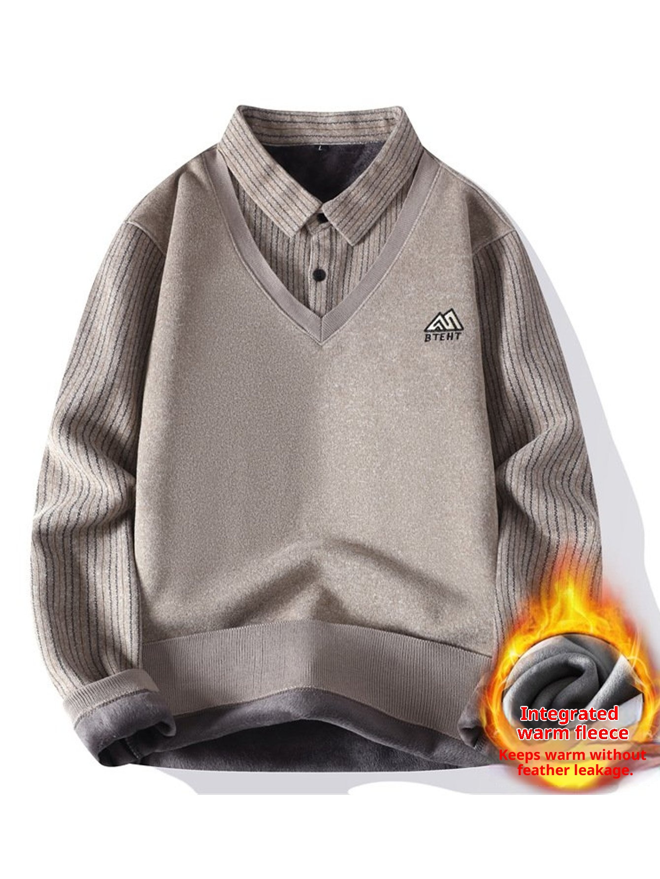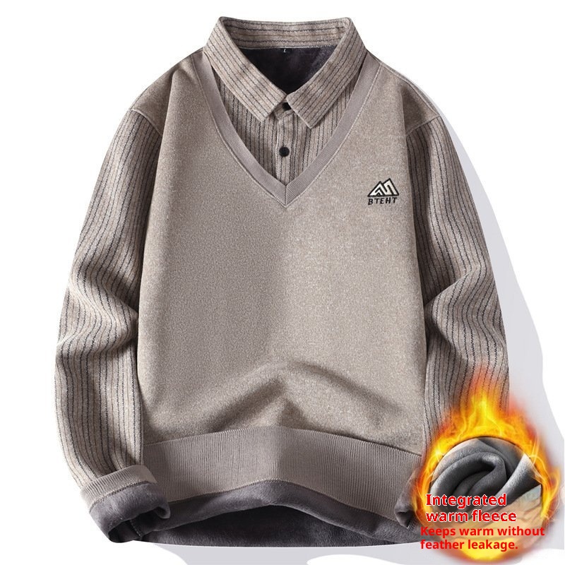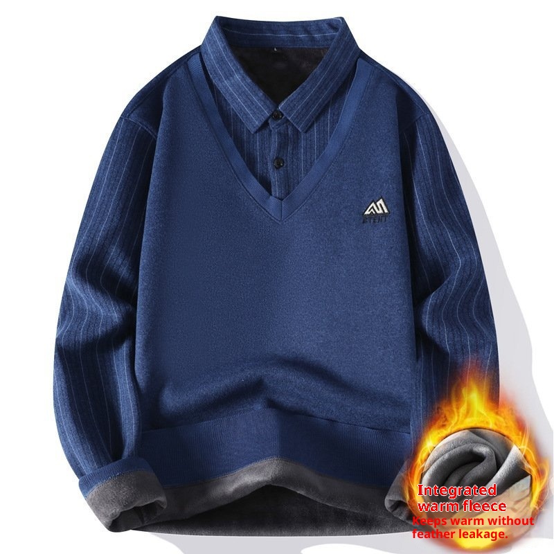 Foreign trade Men's long sleeved lapel fake 2pcs shirt collar with thick velvet sweater for teenagers and men, warm knit sweater, Layering Piece, Office Casual, Classic Knitwear, Warm Material, Durable Stitching, Pullover Sweater, Men’S Sweater