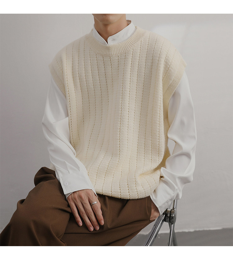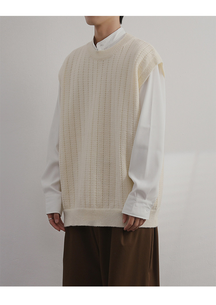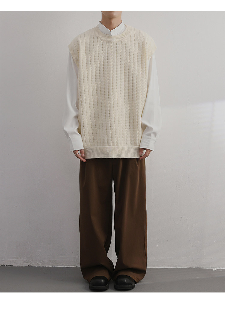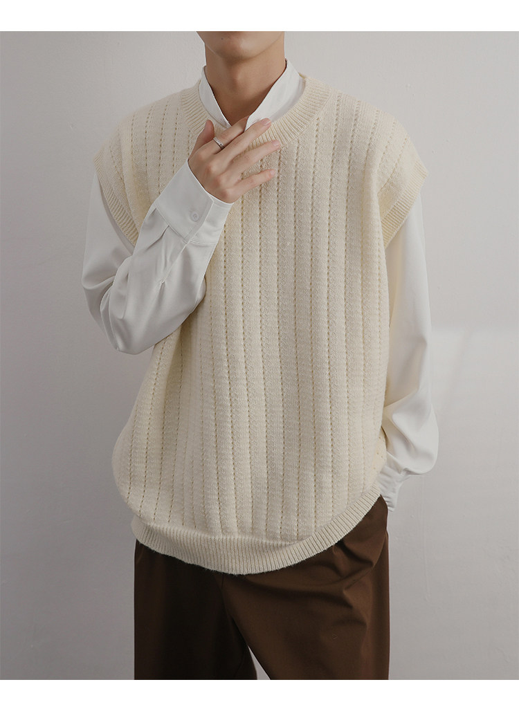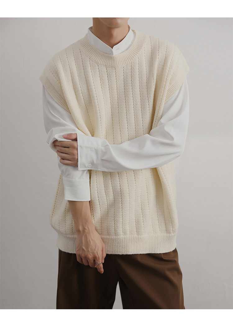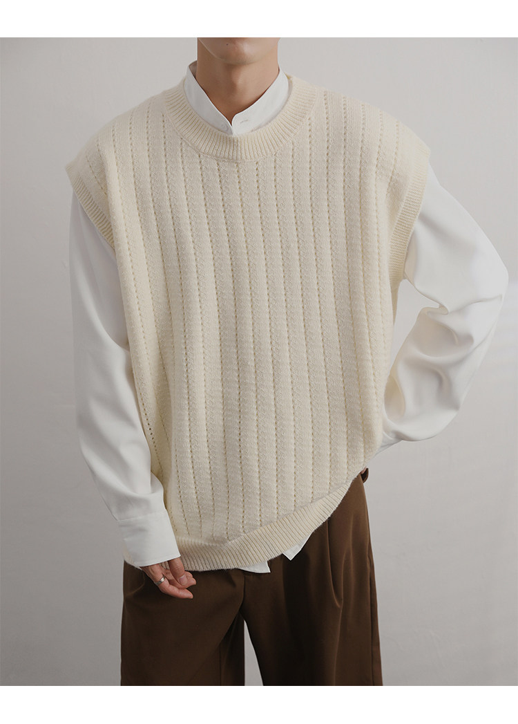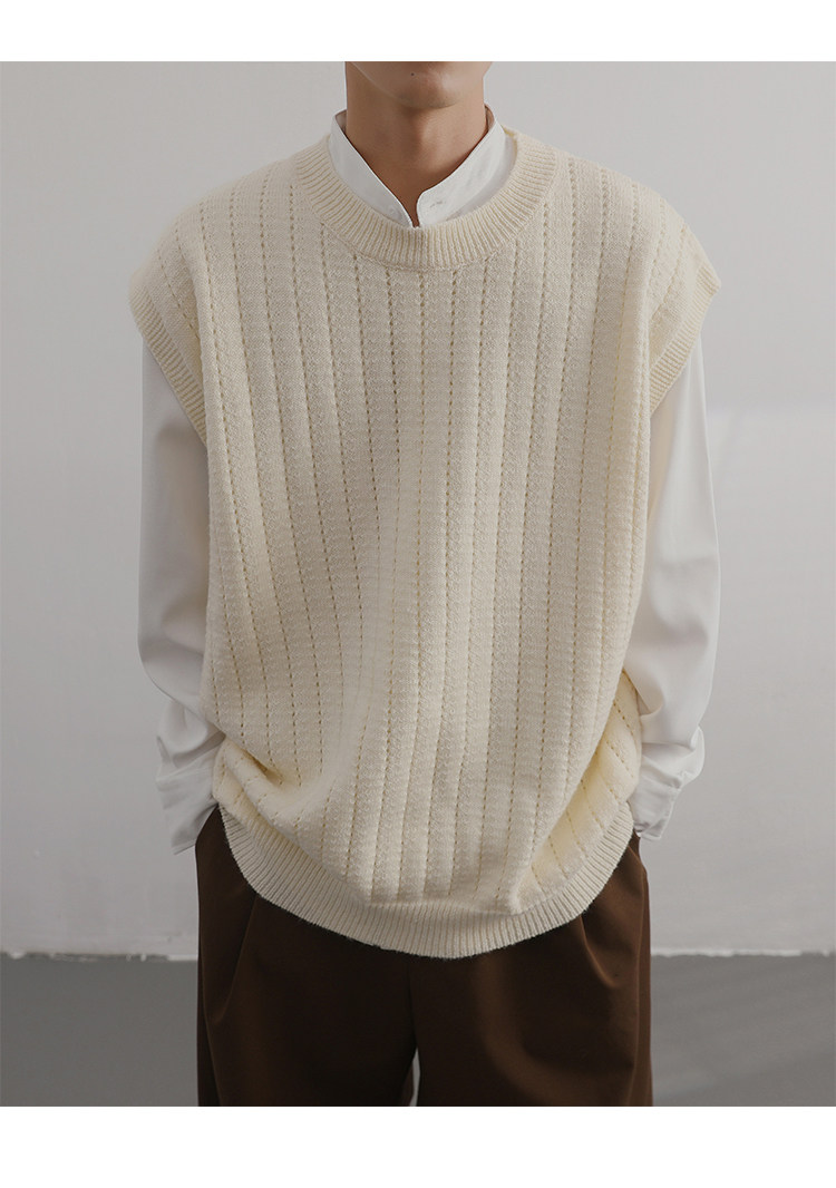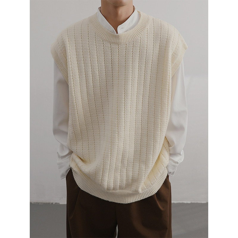Men'S Cashmere Crew Neck Vest | Cream Solid Color with Vertical Textured Knit, Oversized Fit, Casual Lazy Style, Versatile Couple'S Sleeveless Waistcoat for Fall/Winter