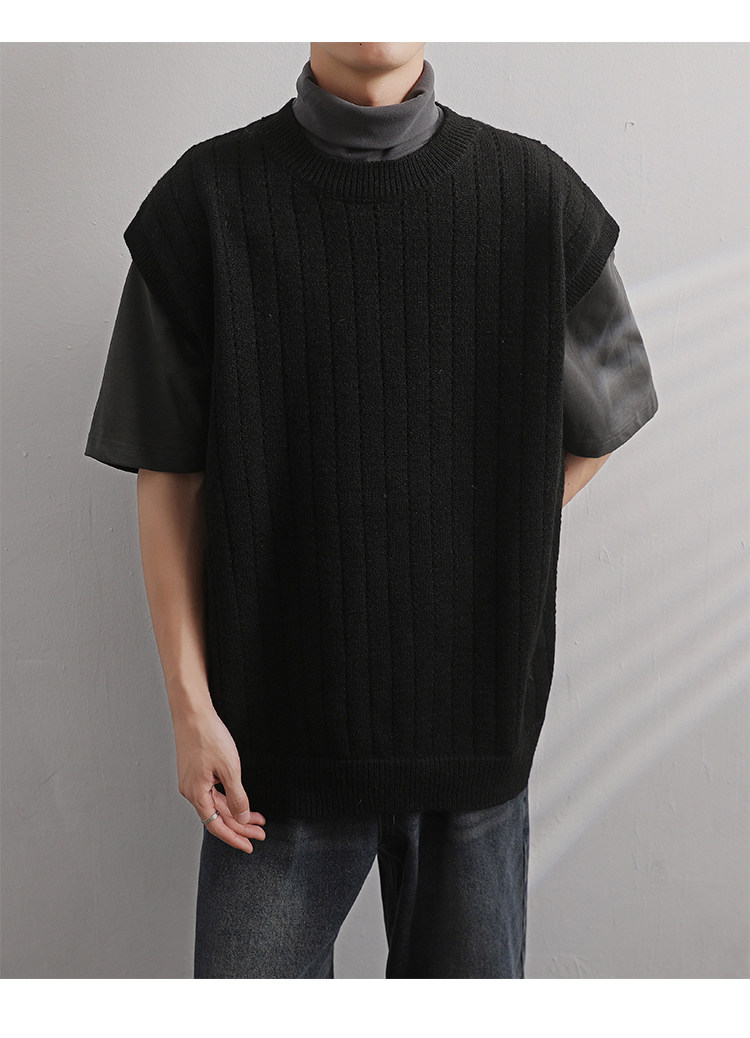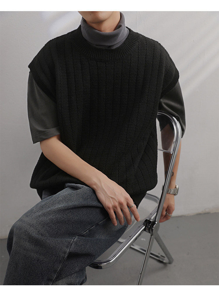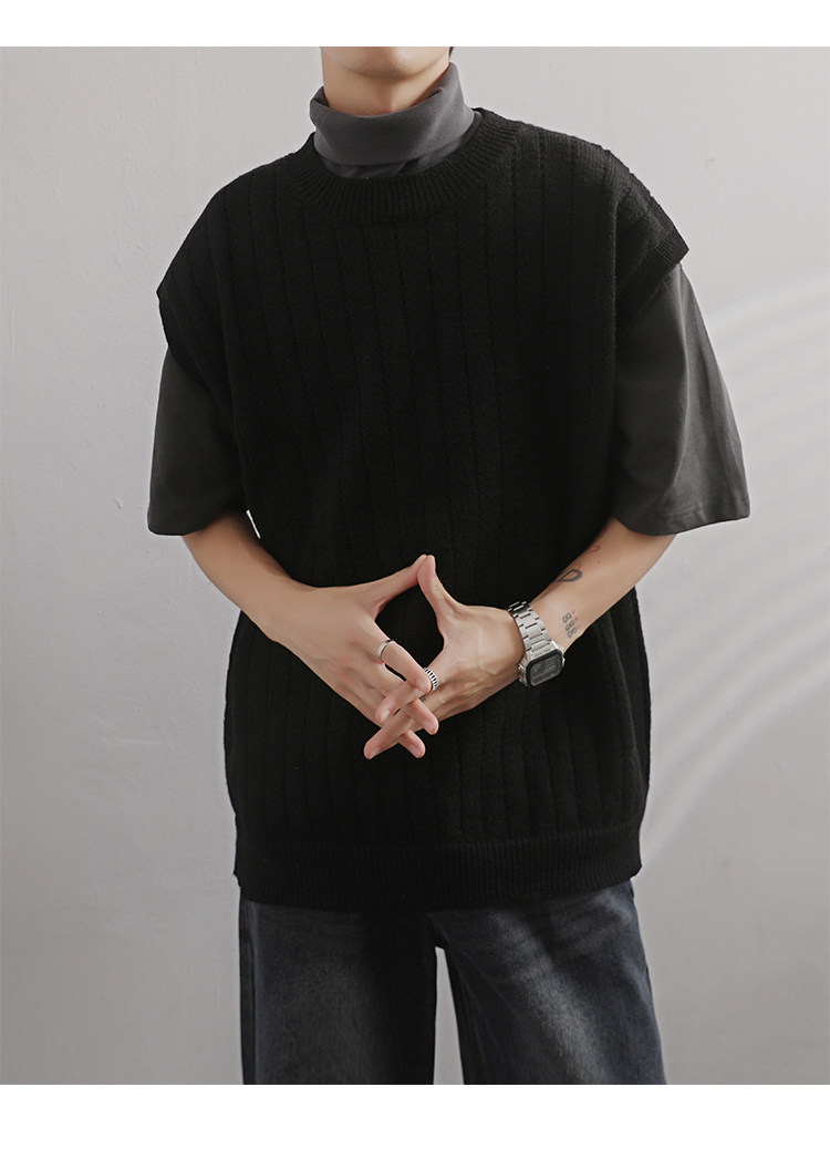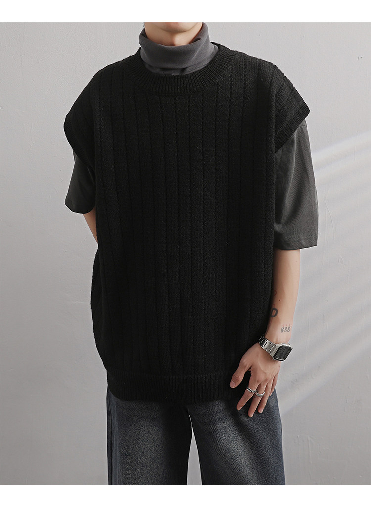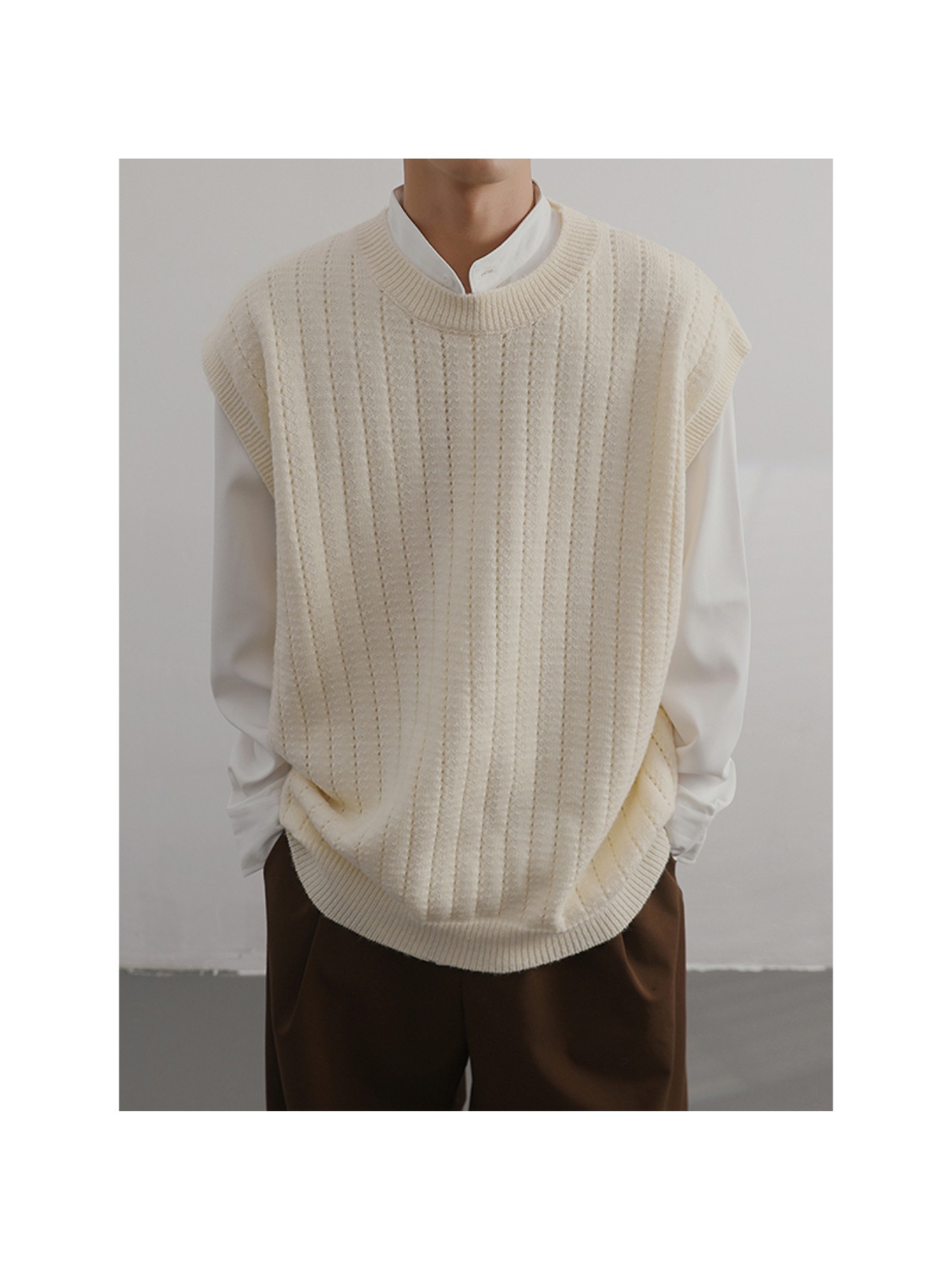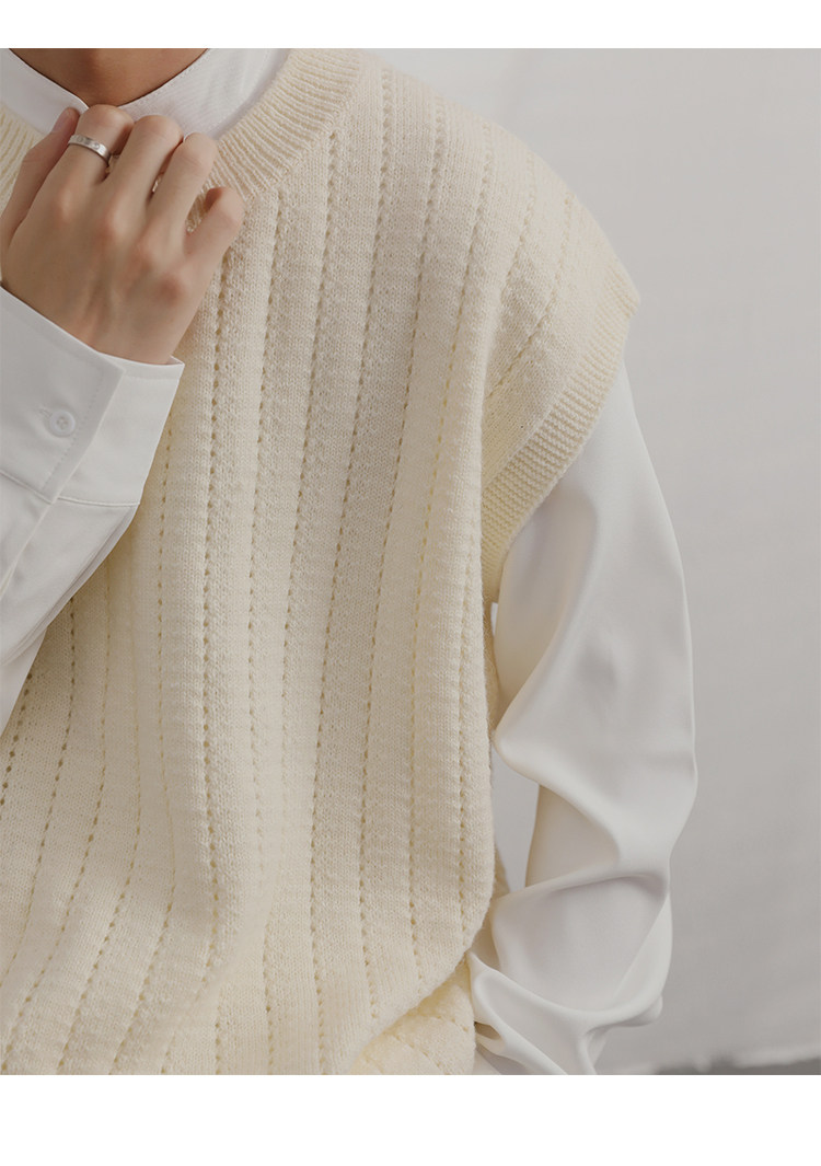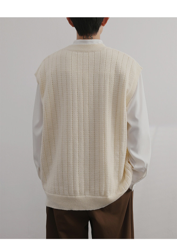 Men'S Cashmere Crew Neck Vest | Cream Solid Color with Vertical Textured Knit, Oversized Fit, Casual Lazy Style, Versatile Couple'S Sleeveless Waistcoat for Fall/Winter
