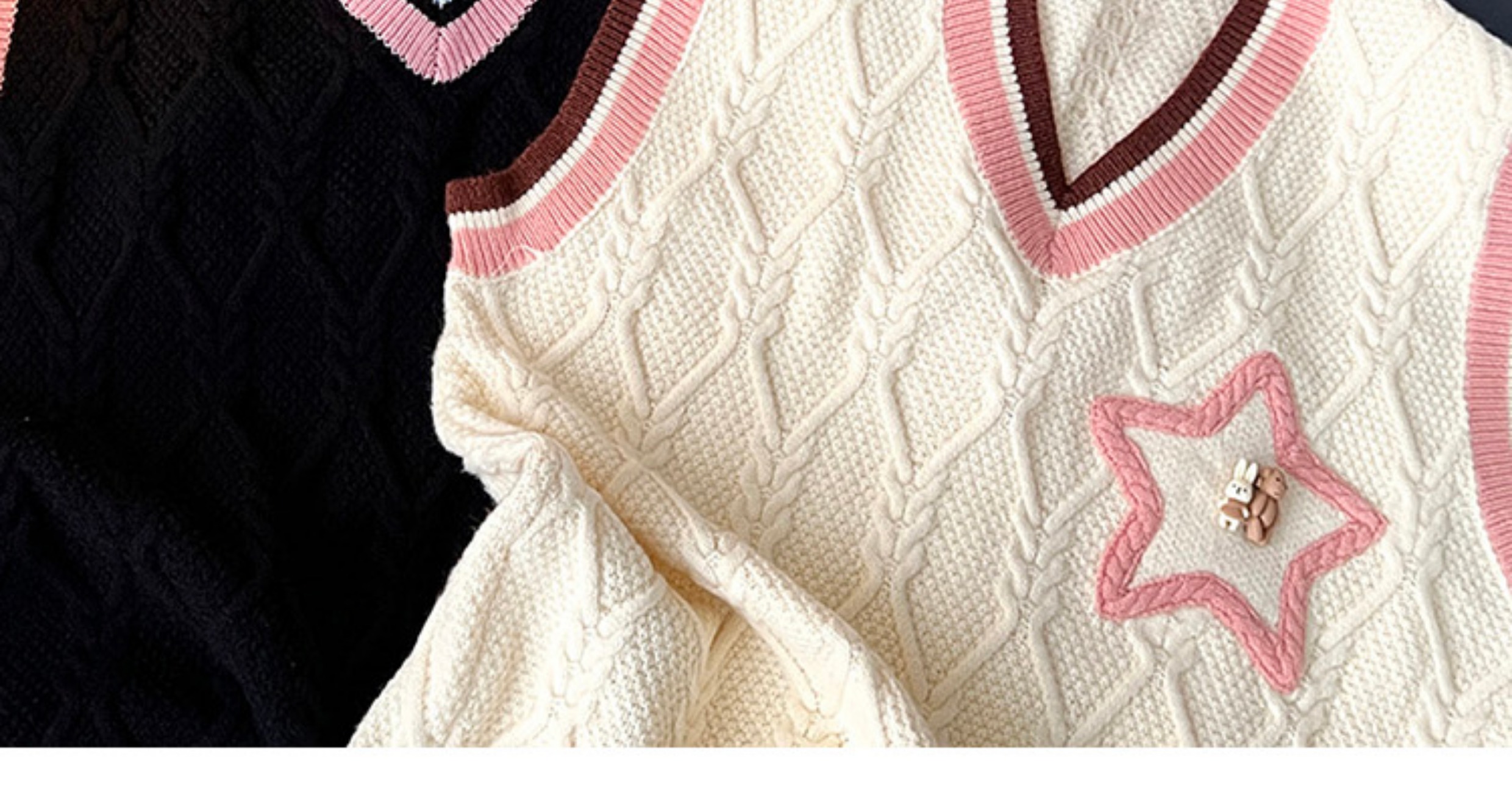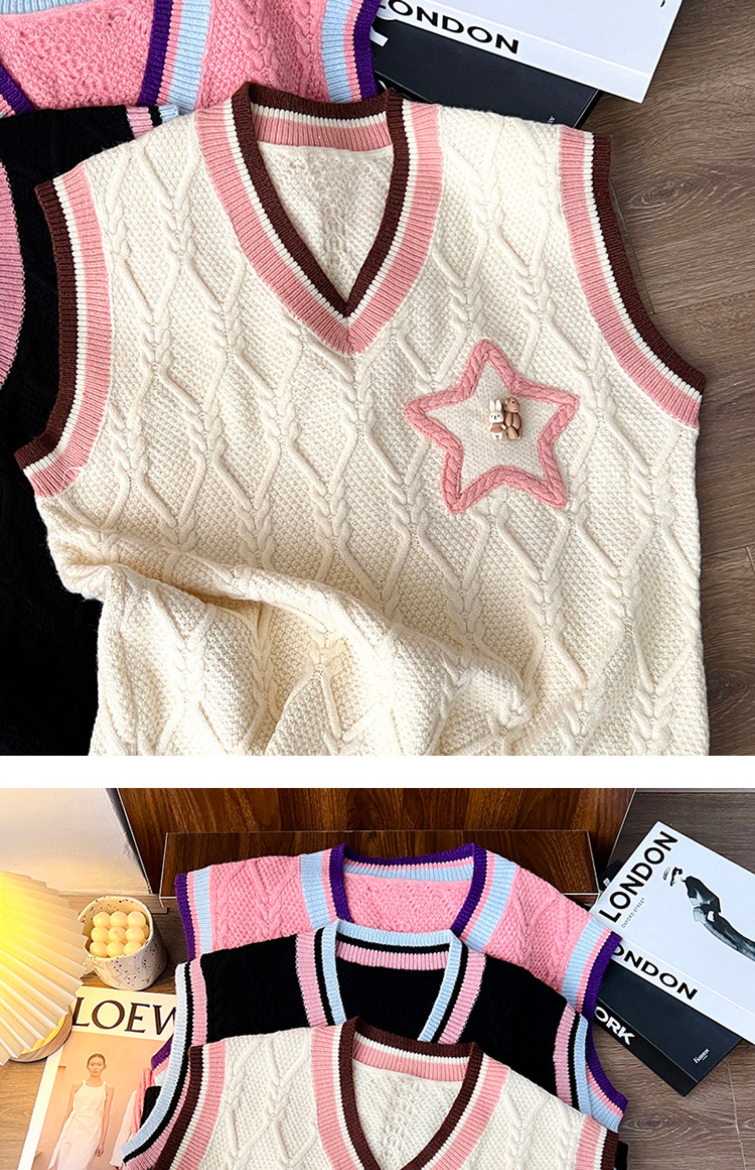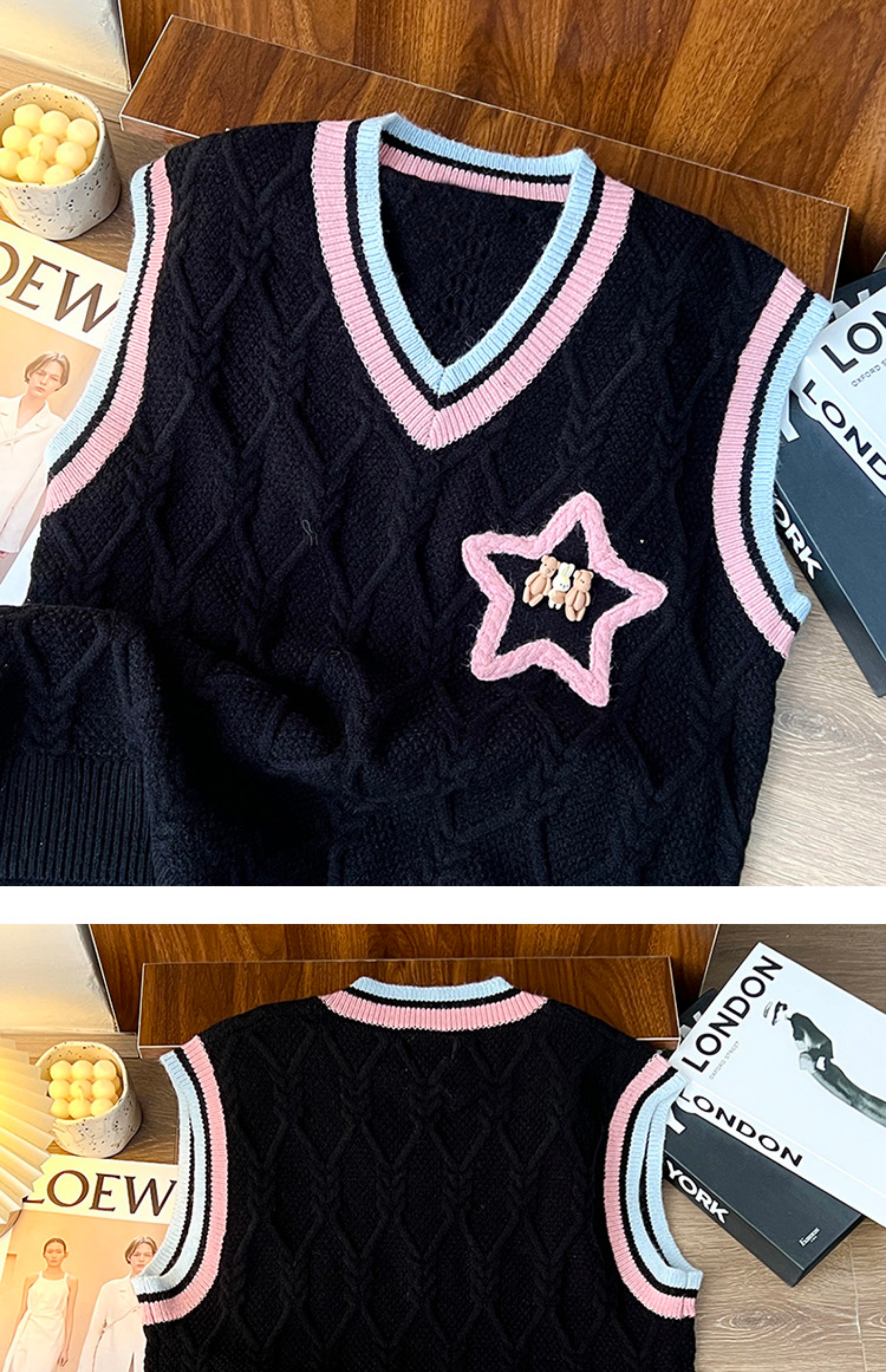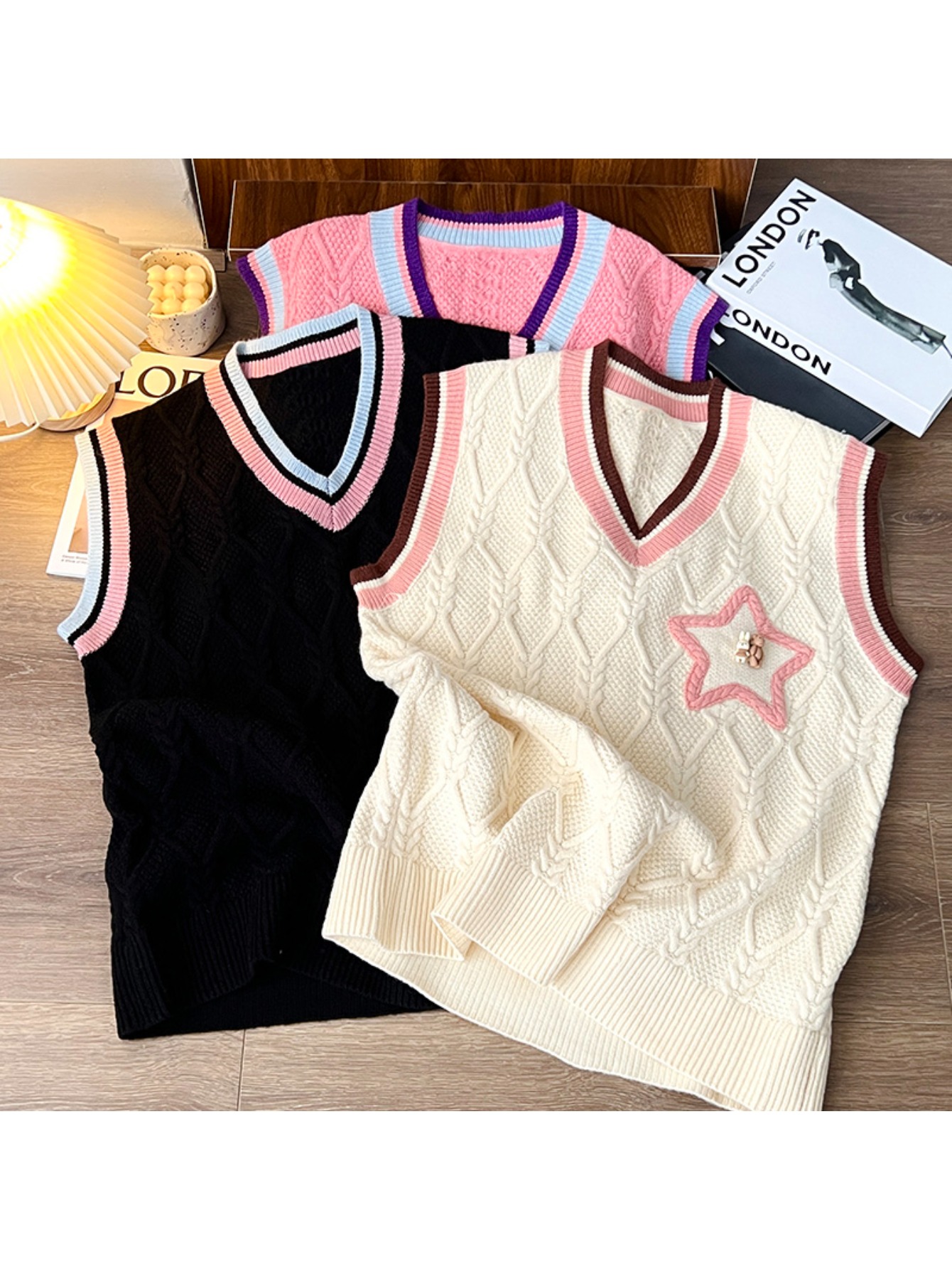 Men'S Velvet Knit Vests in a Collegiate Style, Available in Multiple Colors (Black / Cream / Pink) + Cable Knit Texture + V-Neck with Contrasting Trim + Unique Star Embellishments, a Couple'S Loose-Fitting Sweater Vest Suitable for Casual Campus Out