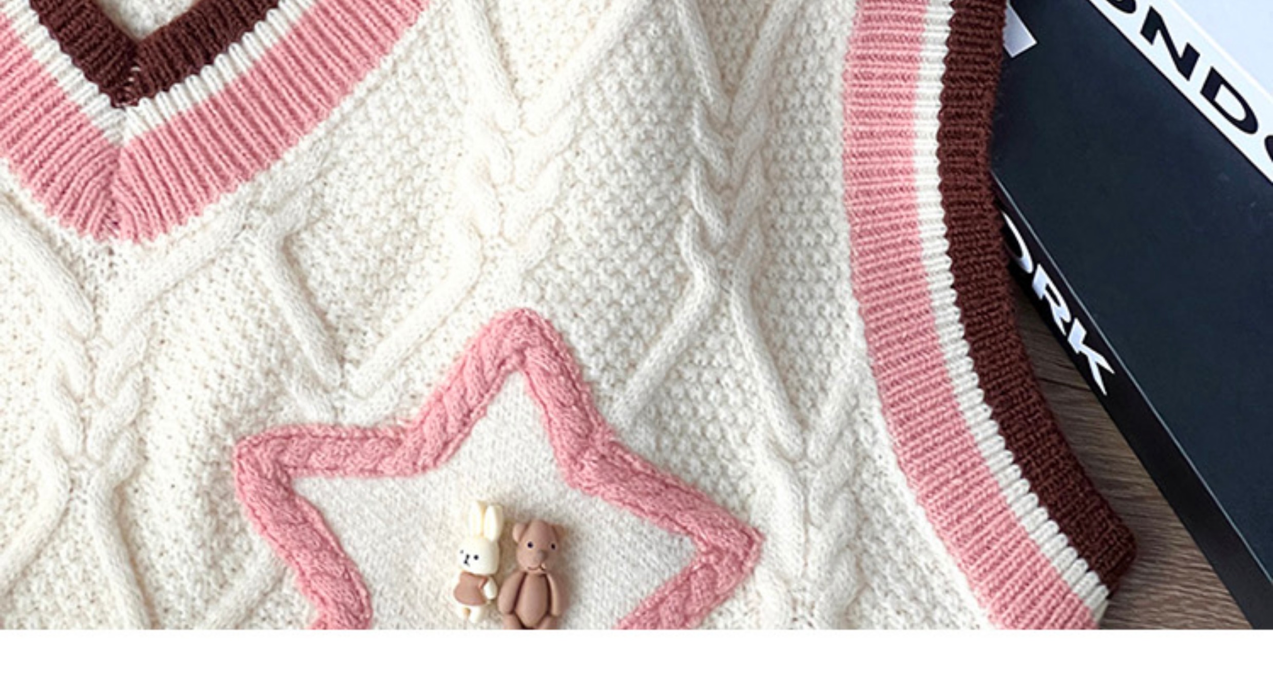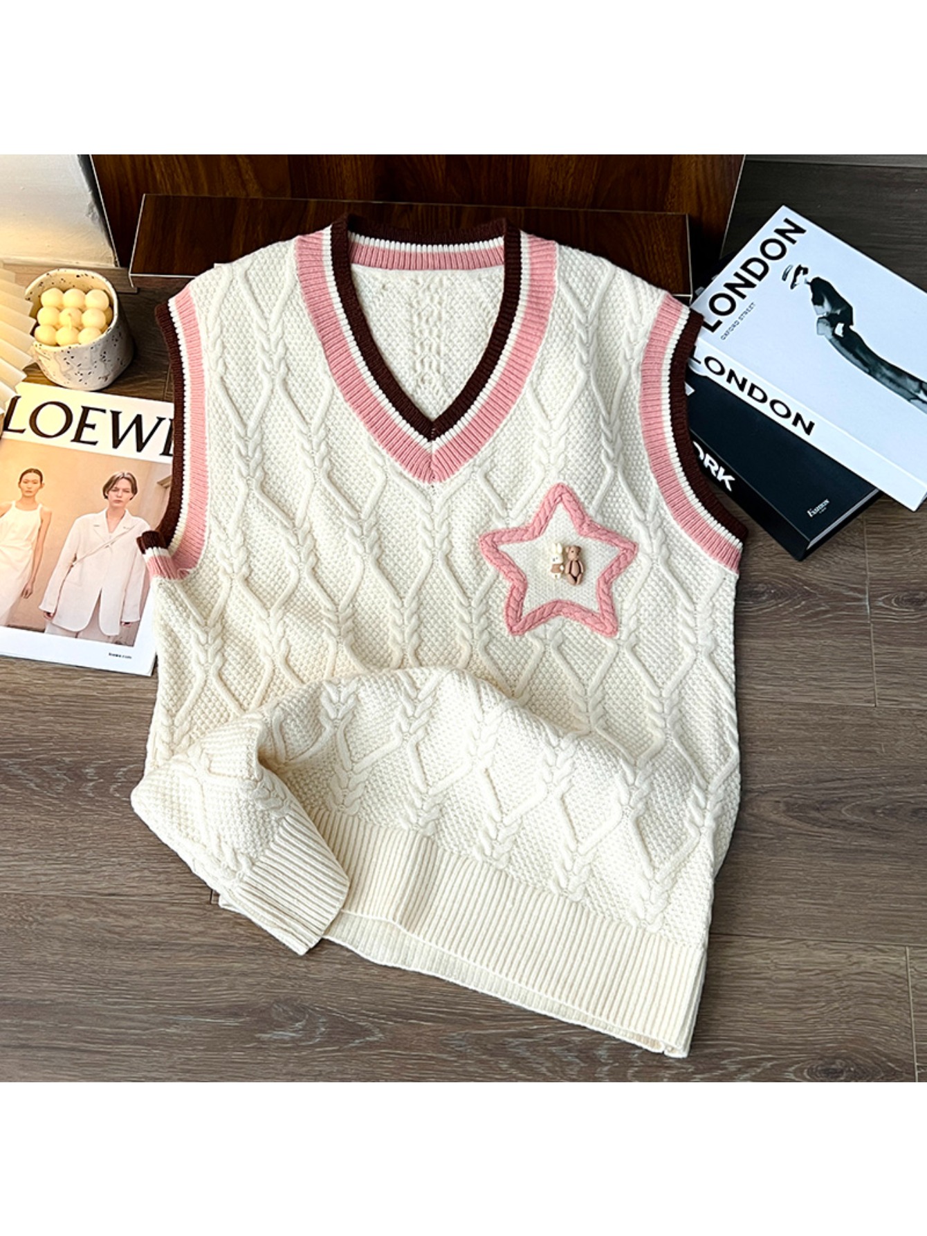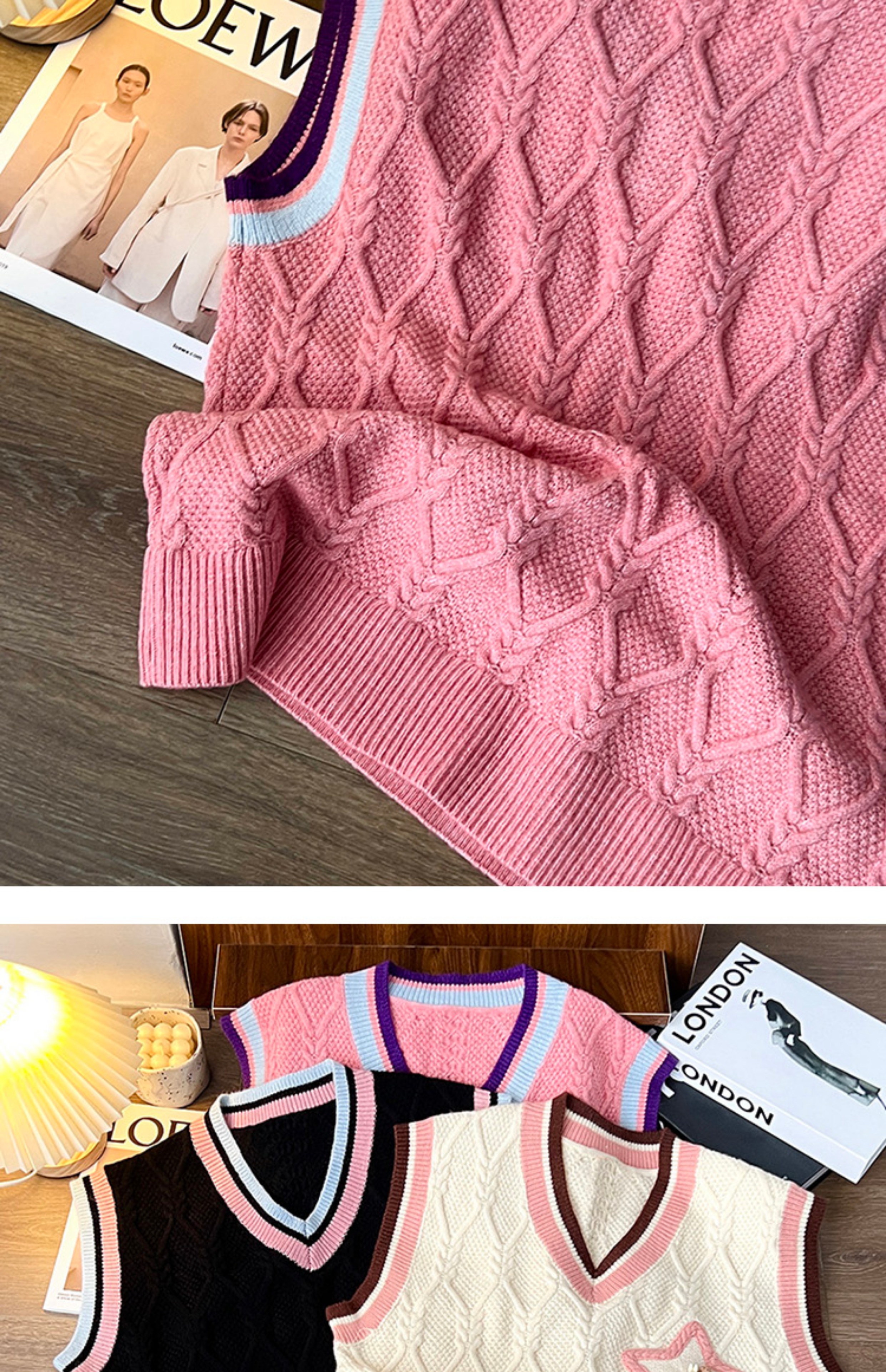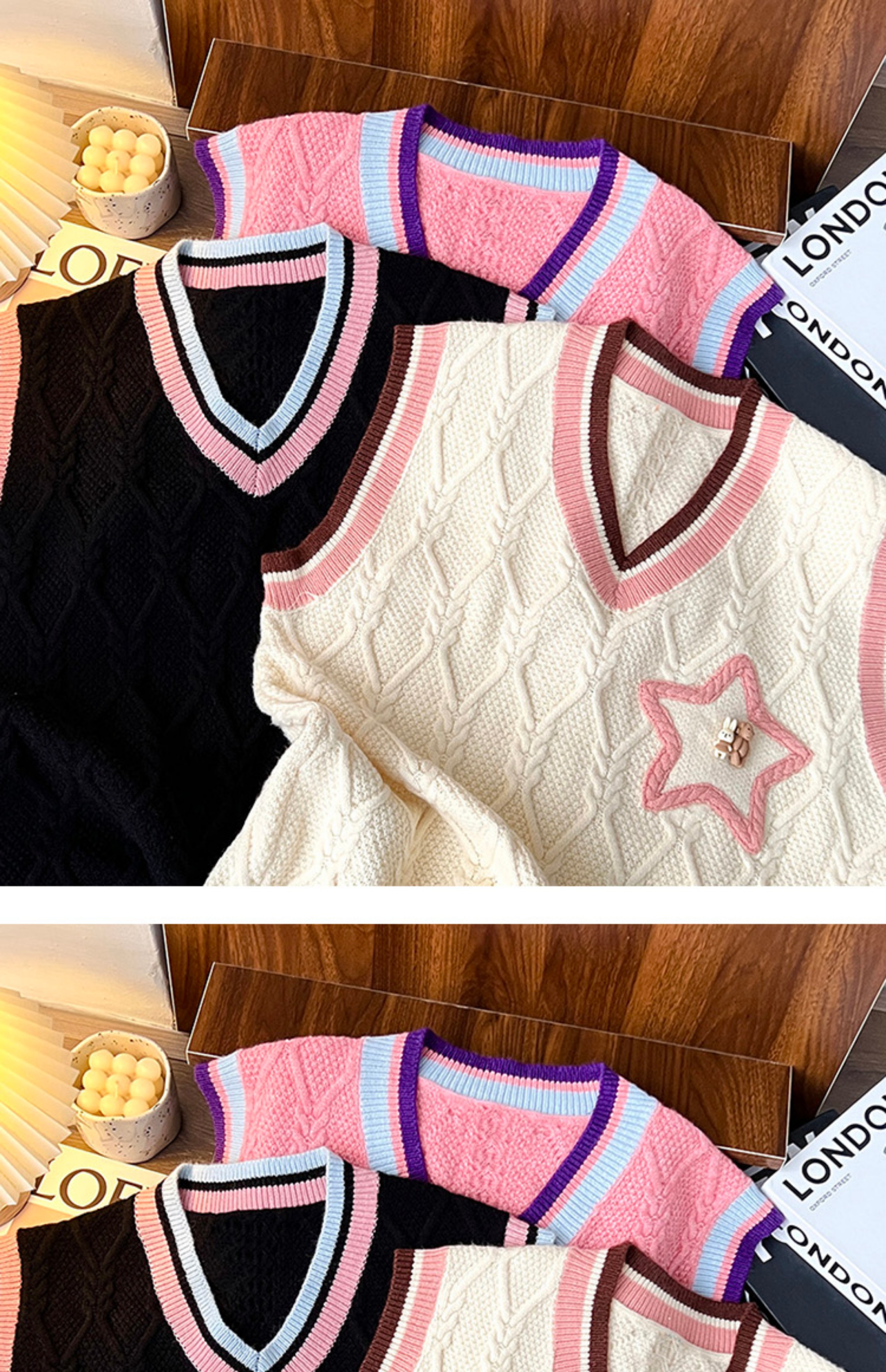 Men'S Velvet Knit Vests in a Collegiate Style, Available in Multiple Colors (Black / Cream / Pink) + Cable Knit Texture + V-Neck with Contrasting Trim + Unique Star Embellishments, a Couple'S Loose-Fitting Sweater Vest Suitable for Casual Campus Out