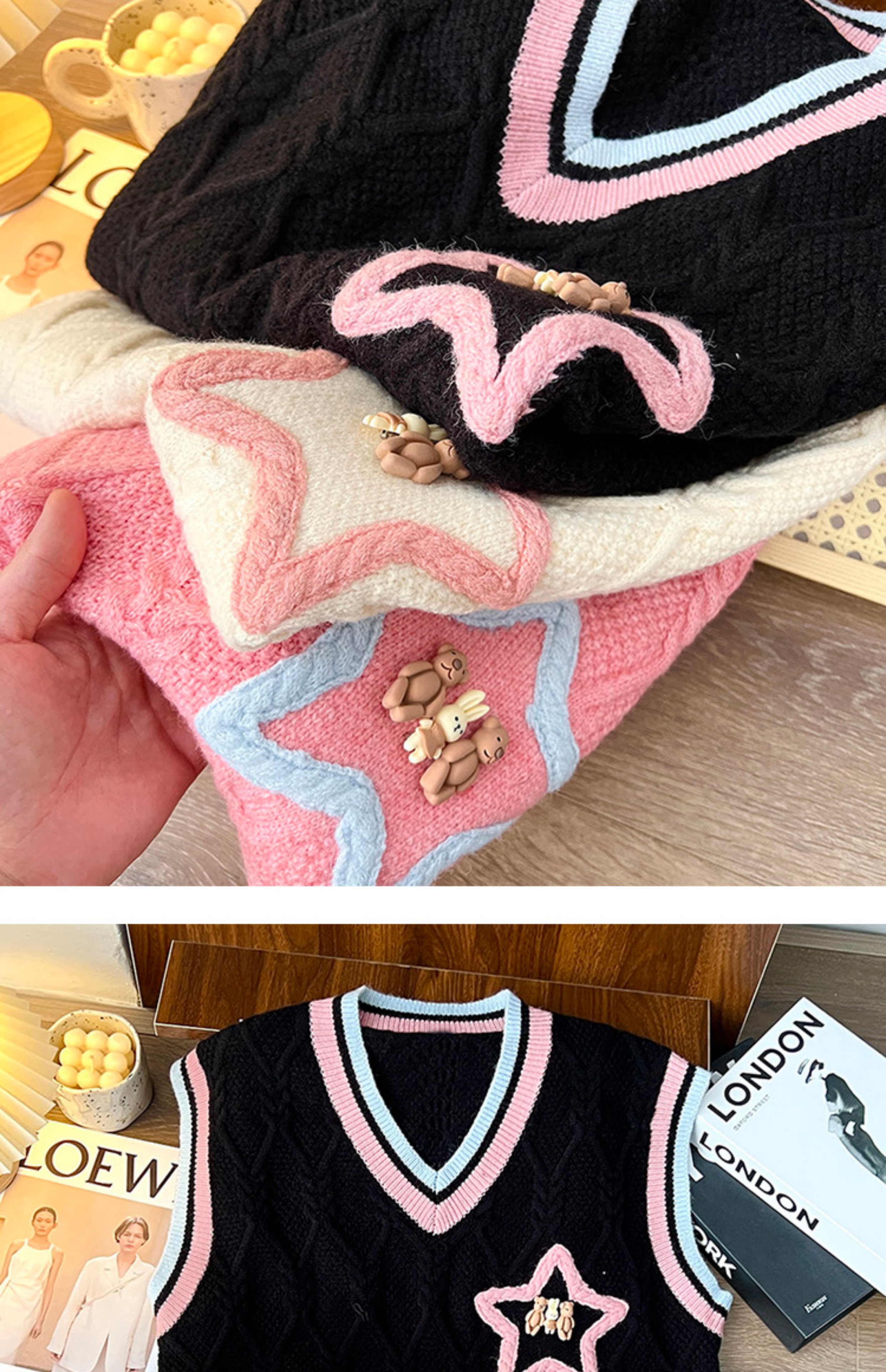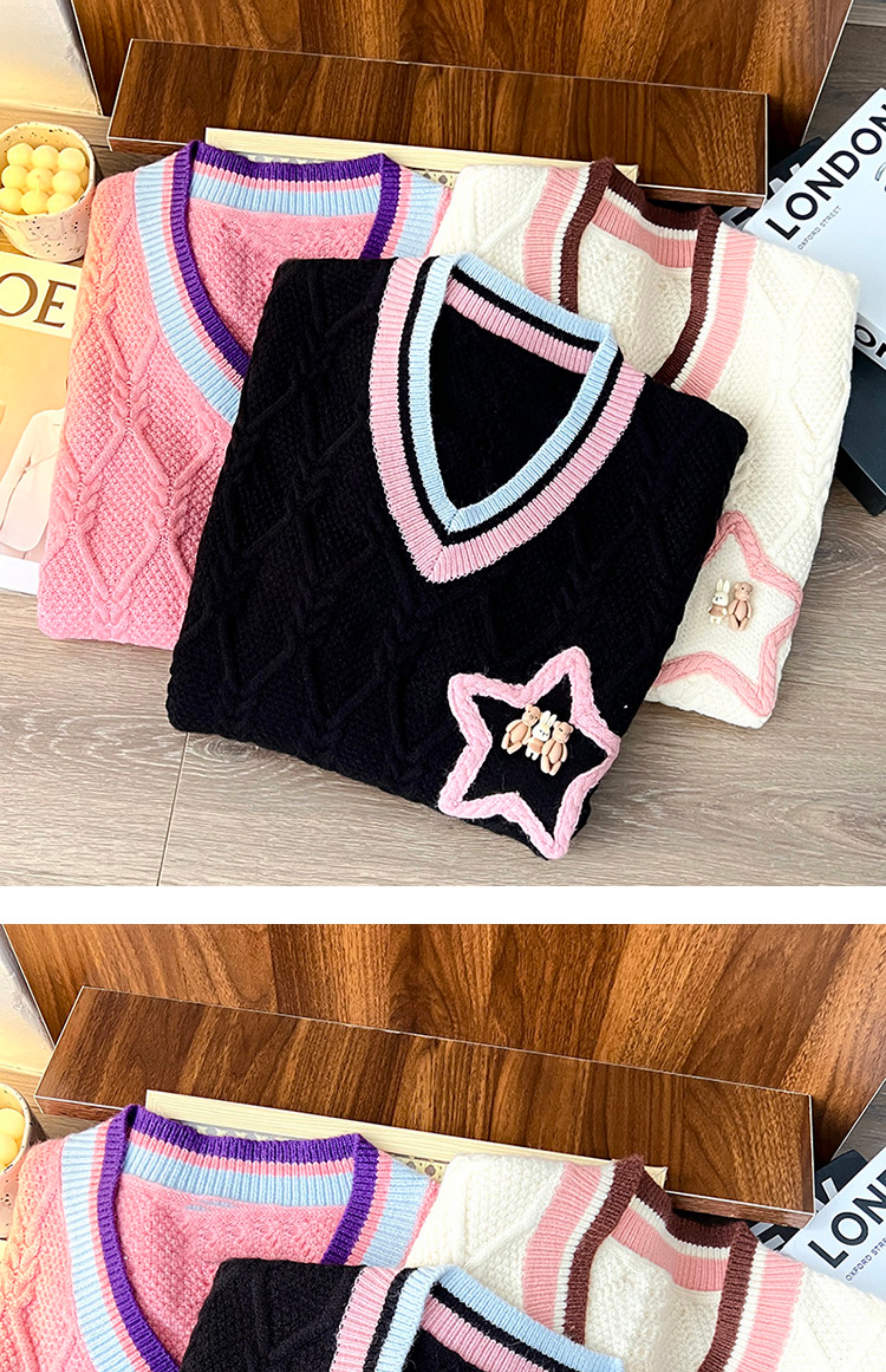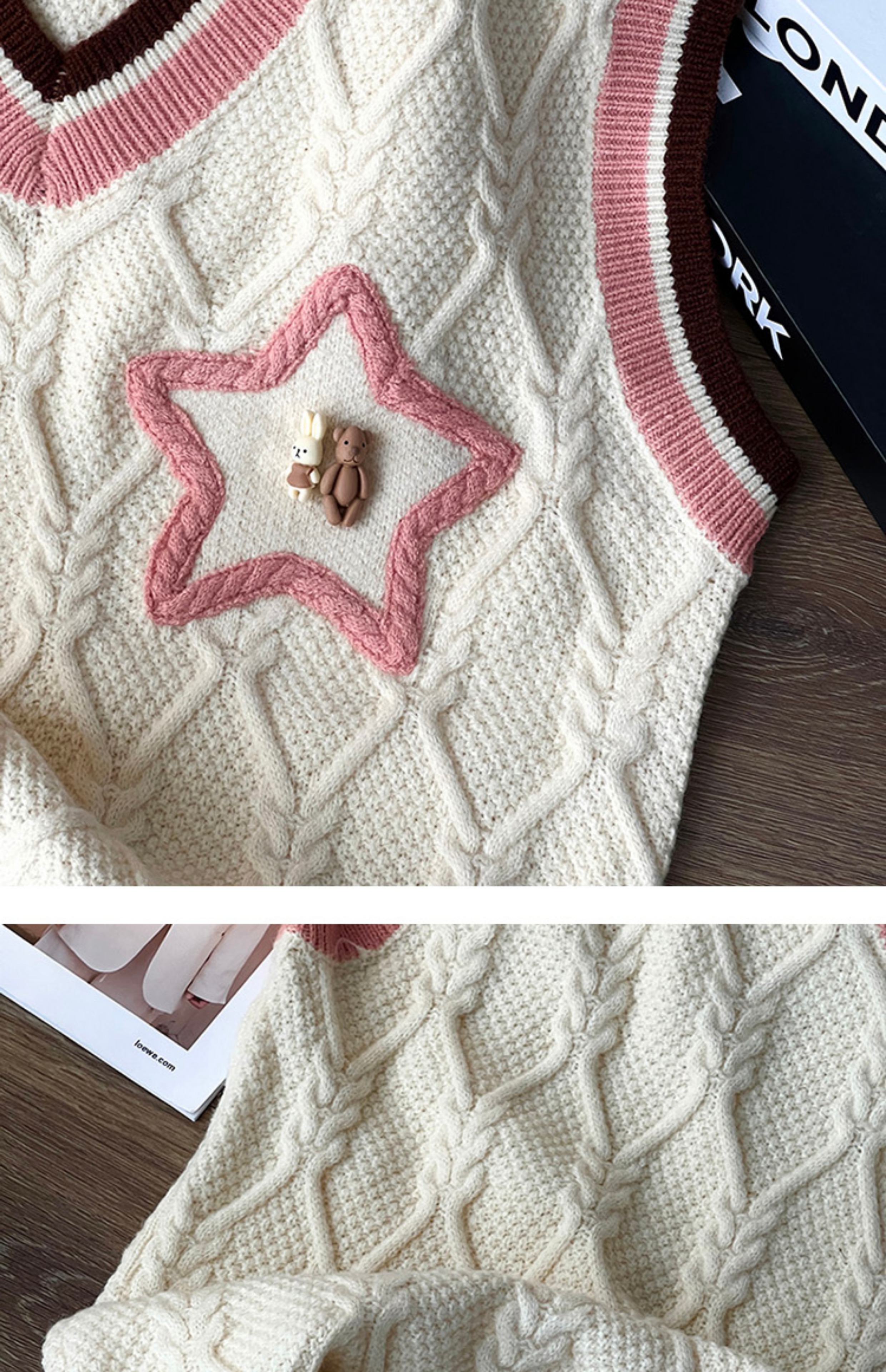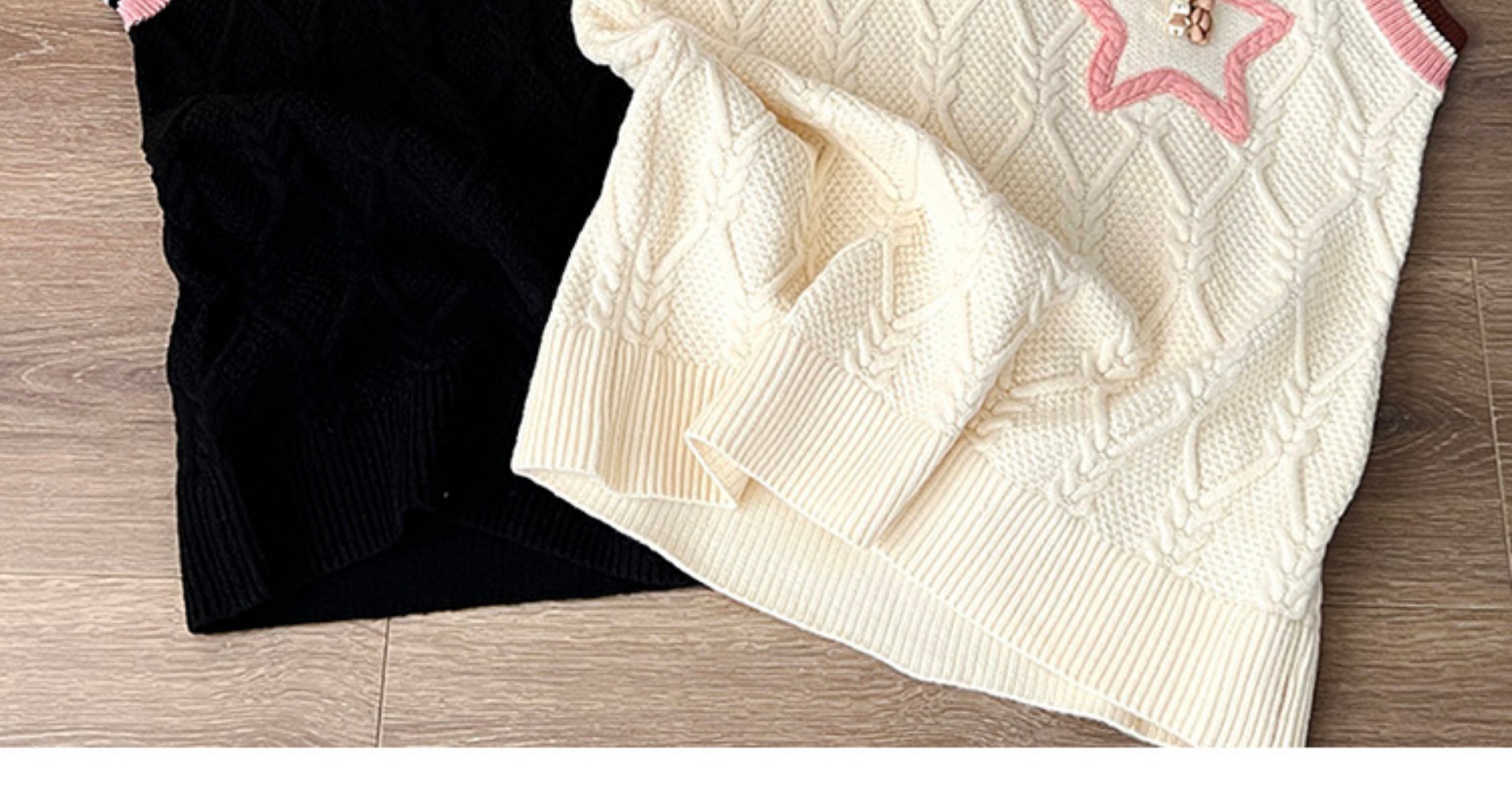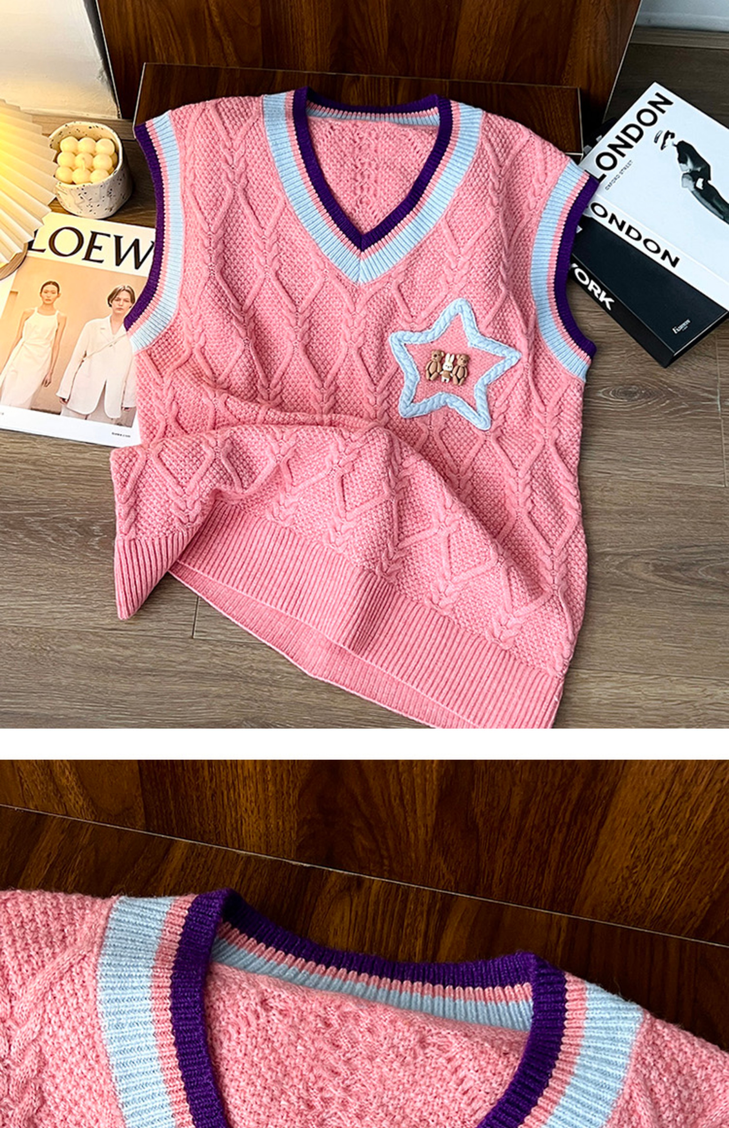 Men'S Velvet Knit Vests in a Collegiate Style, Available in Multiple Colors (Black / Cream / Pink) + Cable Knit Texture + V-Neck with Contrasting Trim + Unique Star Embellishments, a Couple'S Loose-Fitting Sweater Vest Suitable for Casual Campus Out
