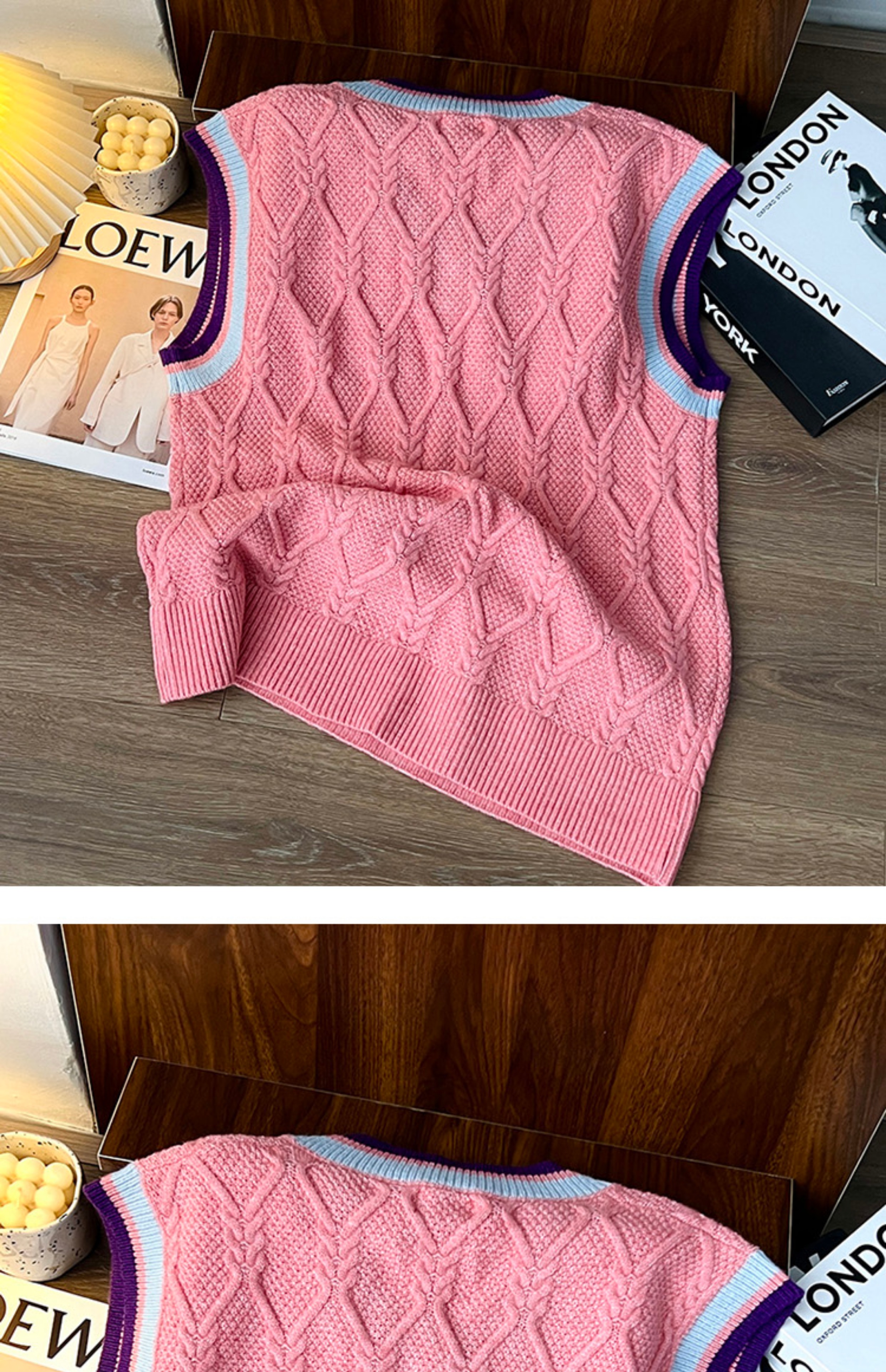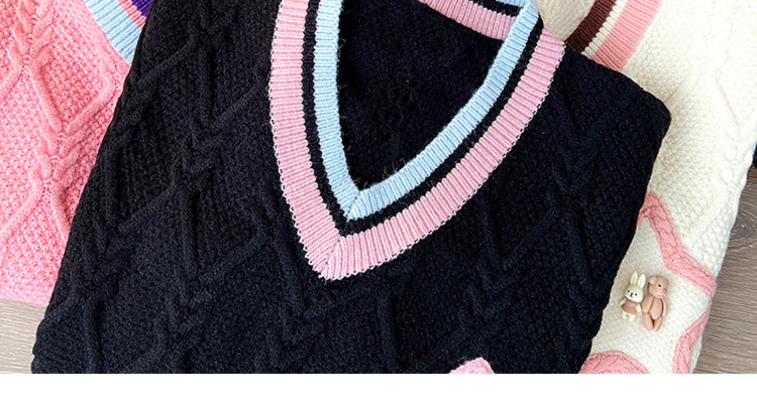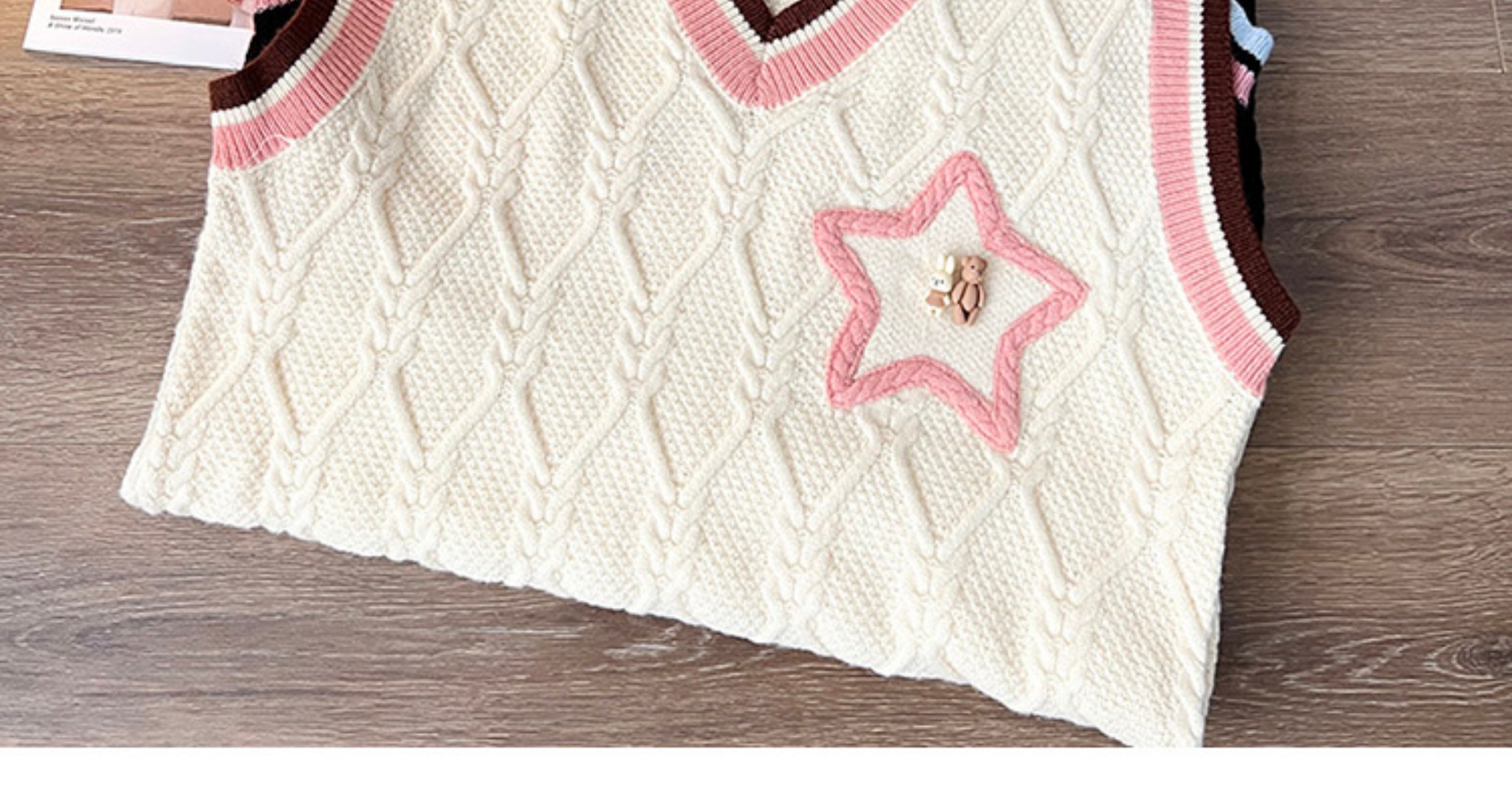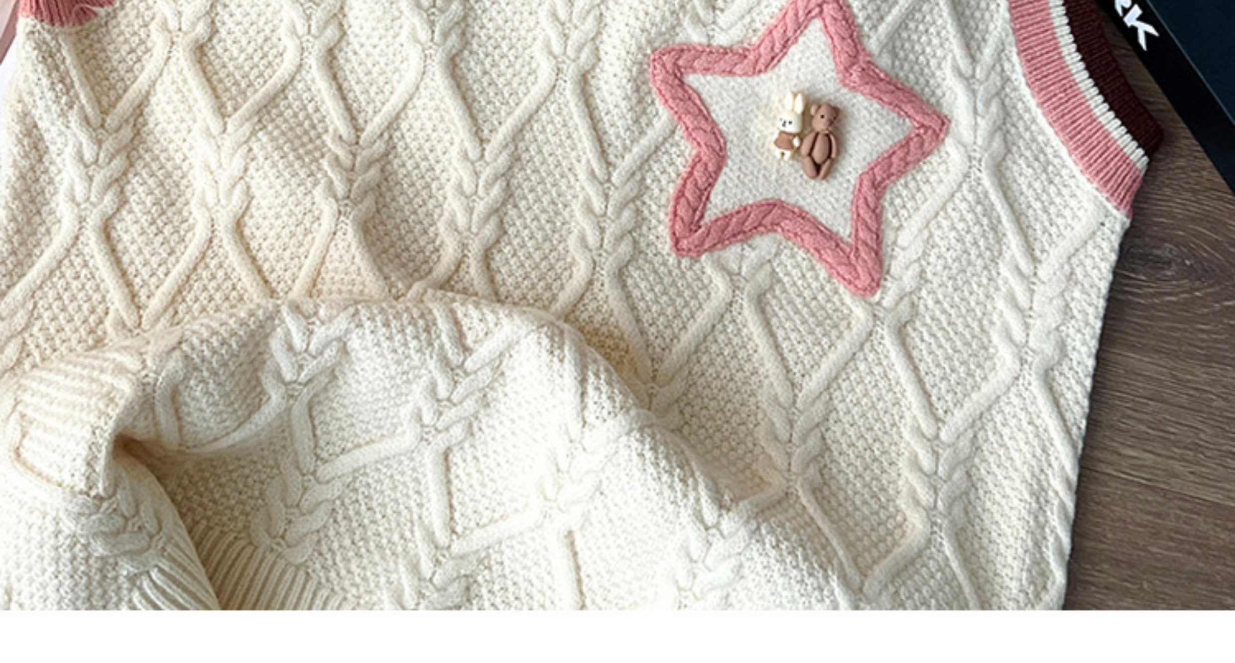 Men'S Velvet Knit Vests in a Collegiate Style, Available in Multiple Colors (Black / Cream / Pink) + Cable Knit Texture + V-Neck with Contrasting Trim + Unique Star Embellishments, a Couple'S Loose-Fitting Sweater Vest Suitable for Casual Campus Out