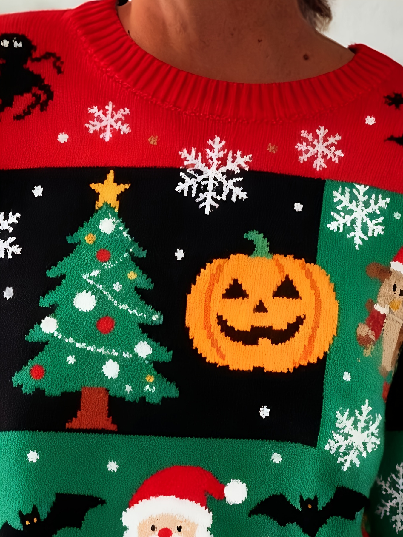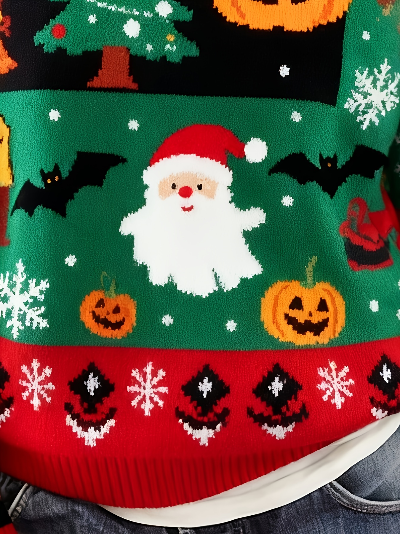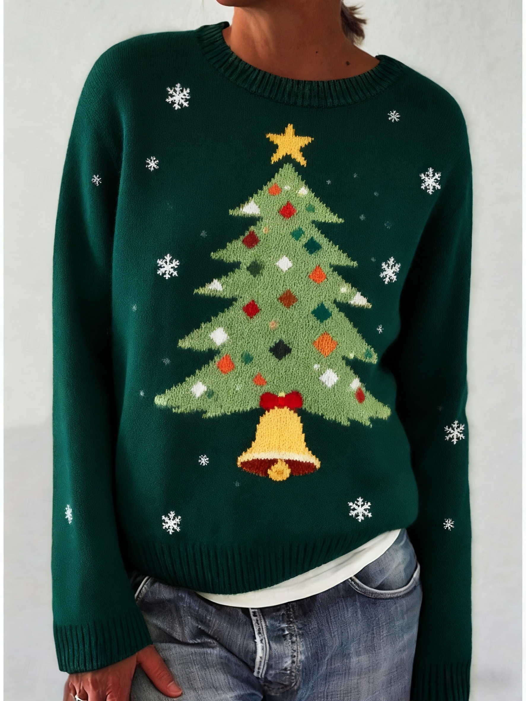 Plus Size, Women's Large Christmas Sweater Sweater Vest-like Top - Green Cable--Like Pattern with Tree & Snowflake Motifs, Long Sleeve Round Neck Pullover for Holiday Parties, Winter Casual Wear (Plus Size, Cozy -Like Texture) - Easy